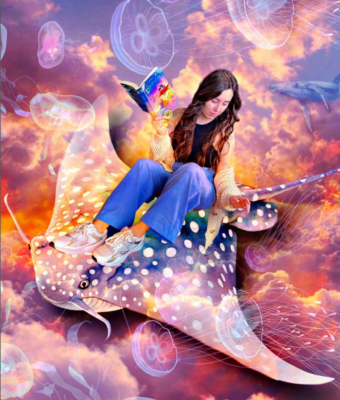 « Là, au creux des nuages cotonneux qui s’étendaient en dessous de l’île, dissimulant le vide, une nageoire caudale immense venait d’apparaître. Majestueuse, constellée d’une myriade de points lumineux, elle s’enfonça au cœur de la nuée avant de s’évanouir comme si elle n’avait jamais été là. Pourtant, le rythme cardiaque effréné de Nayla et la larme qui dévalait sa joue témoignaient de cette vision bien réelle.