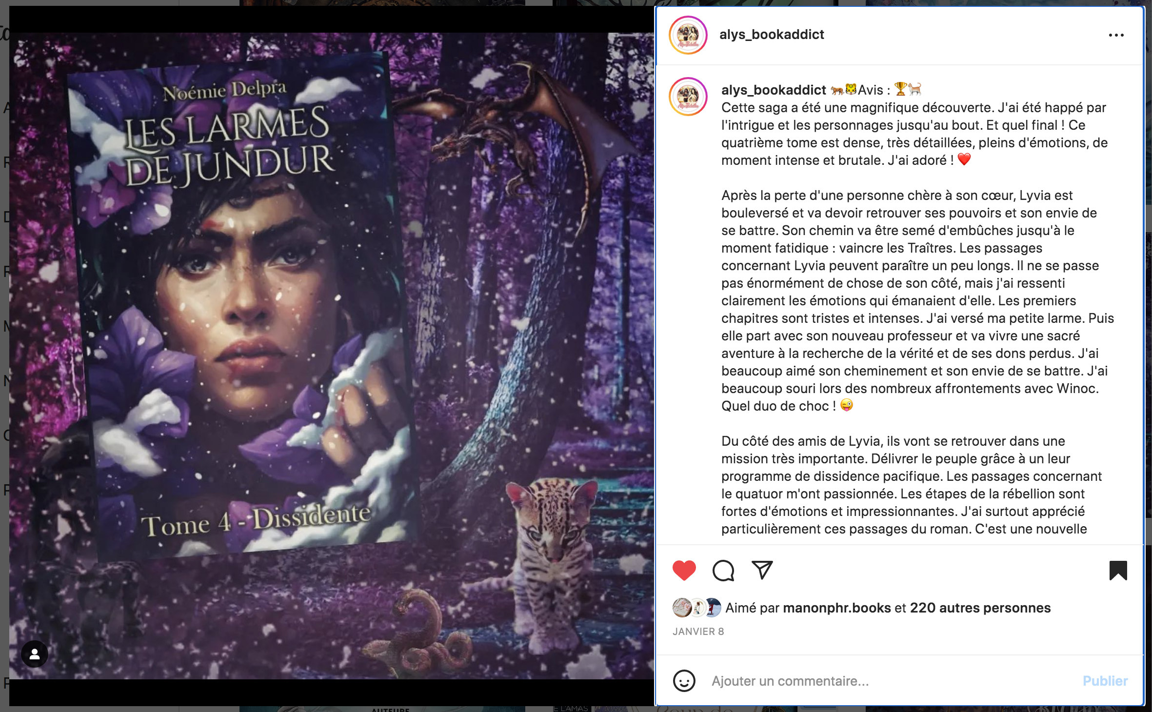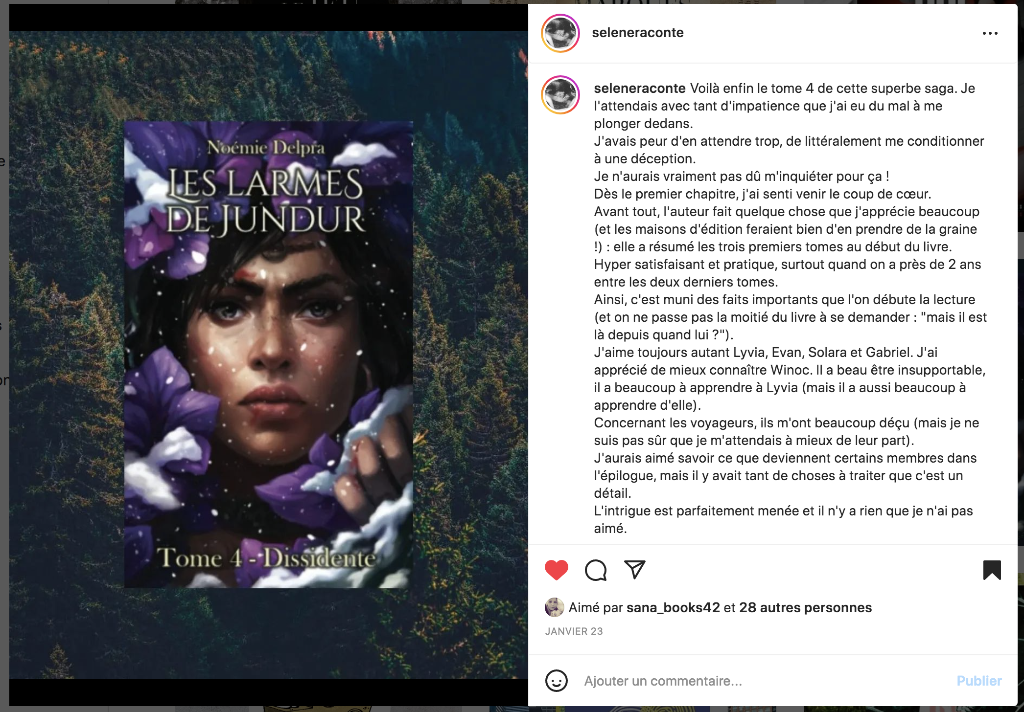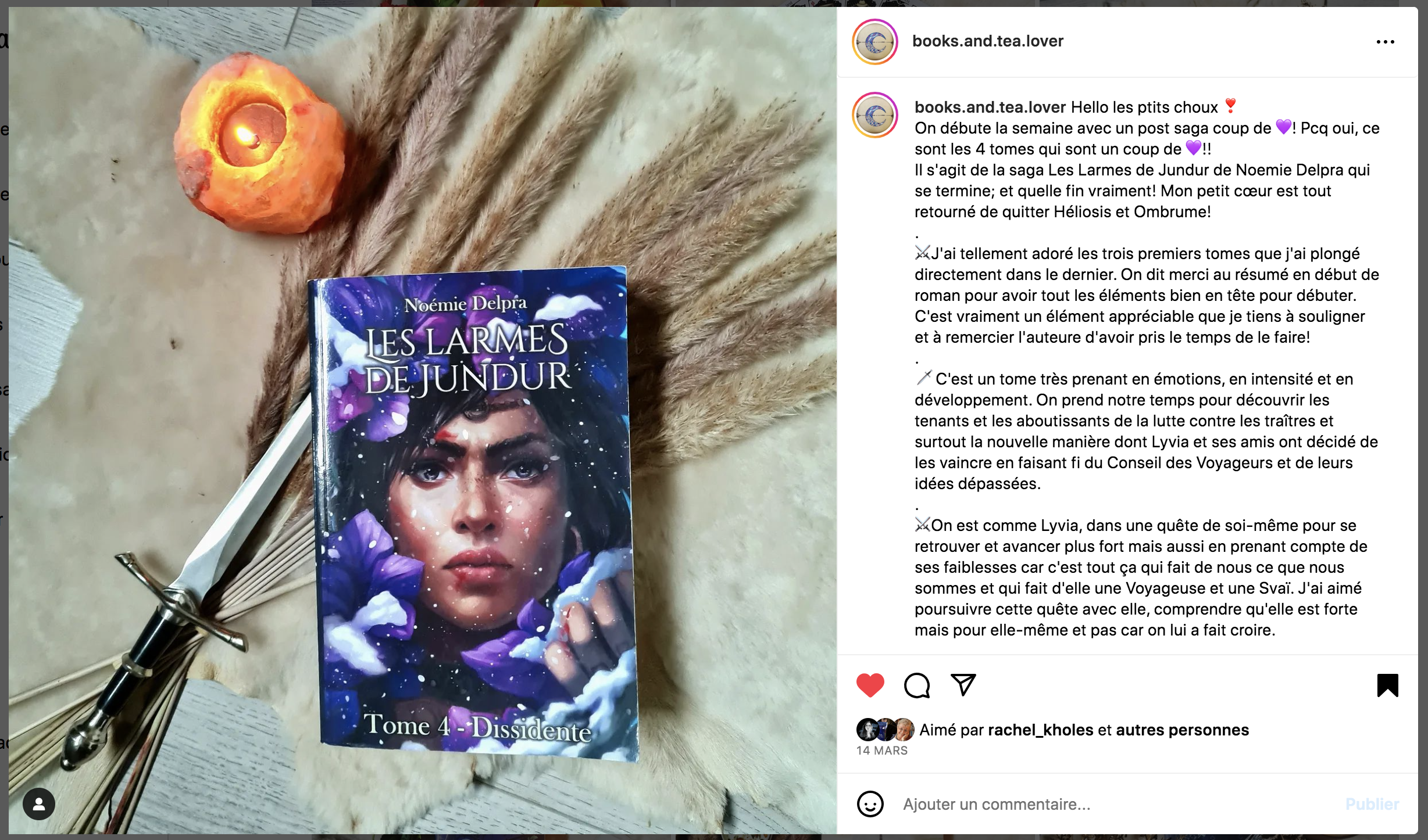 « Cette saga a été une magnifique découverte. J’ai été happé par l’intrigue et les personnages jusqu’au bout. Et quel final ! Ce quatrième tome est dense, très détaillé, pleins d’émotions, de moment intense et brutale. J’ai adoré ! ❤️ [...] Merci infiniment Noémie Delpra pour cette fabuleuse aventure et de m’avoir permis de découvrir le monde des Voyageurs. J’aimerais en faire partie. C’est possible ? »